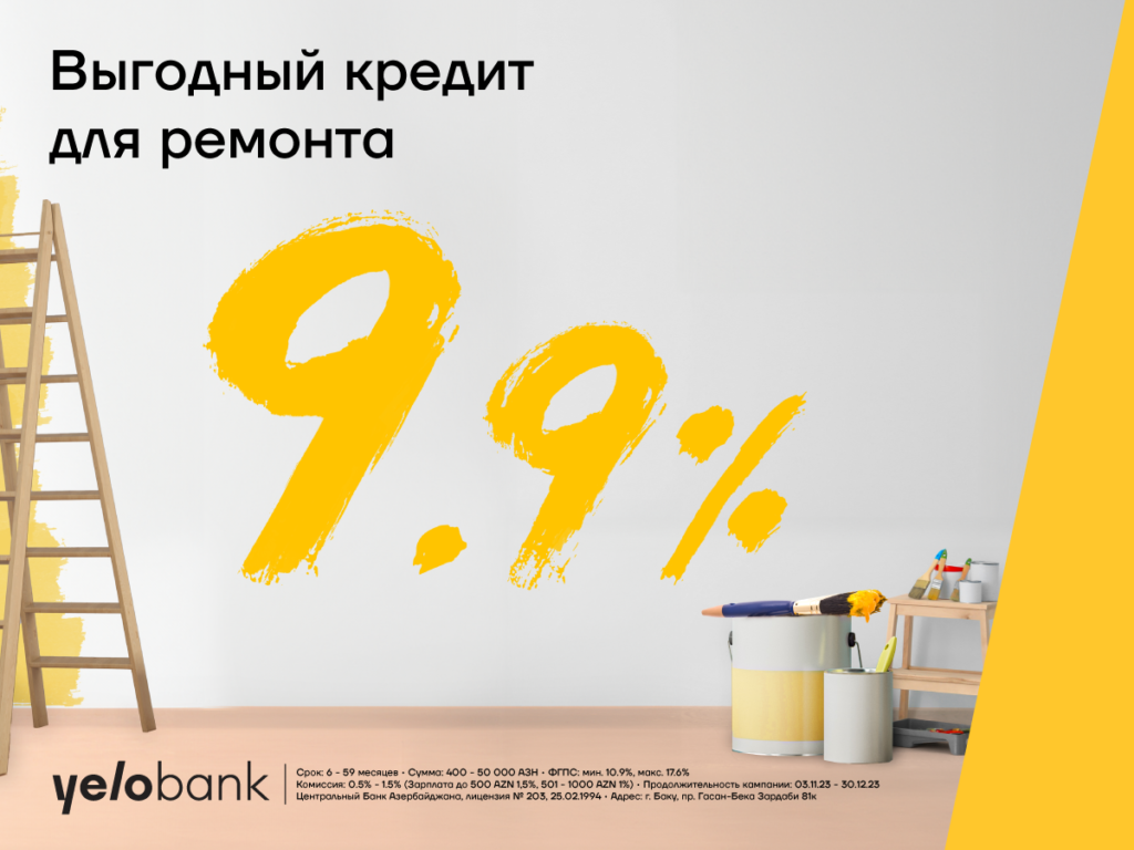 В каждом доме со временем возникает необходимость капитального ремонта. Иногда такая потребность возникает совершенно неожиданно. Yelo Bank предлагает вам отличную возможность для решения ваших неотложных дел! Сейчас вы можете получить наличный кредит в банке всего под 9.9% годовых, с комиссией 0.5%. Максимальная сумма кредита составляет 50 000 AZN, а срок — до 59 месяцев.