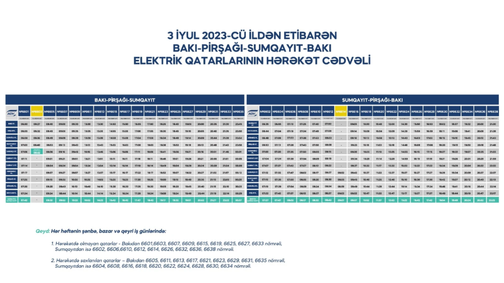 Bununla yanaşı, həftə içi Bakı-Pirşağı-Sumqayıt istiqaməti üzrə saat 13:30-da, Sumqayıt-Pirşağı-Bakı istiqamətində isə saat 14:30-da hərəkətdə olan reyslər həftəsonları və qeyri-iş günlərində də eyni saatlarda hərəkətdə olacaqlar.