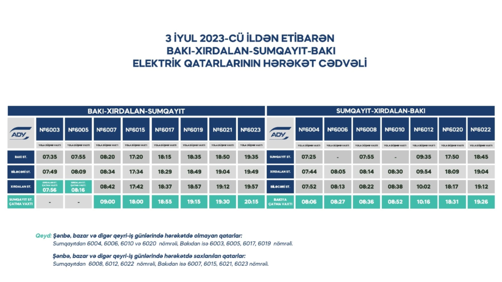 Eyni zamanda 03 iyul tarixindən etibarən Ağstafadan Bakıya yola düşən qatarın paytaxta saat 23:15-də çatmasını nəzərə alaraq Bakı-Pirşağı-Sumqayıt istiqamətində saat 22:45-də yola düşən sonuncu sərnişin qatarının hərəkət qrafikində dəyişiklik edilib. Belə ki, 03 iyul tarixindən etibarən müvafiq istiqamət üzrə qatar yenilənmiş cədvələ əsasən saat 23:45-də yola düşəcək.