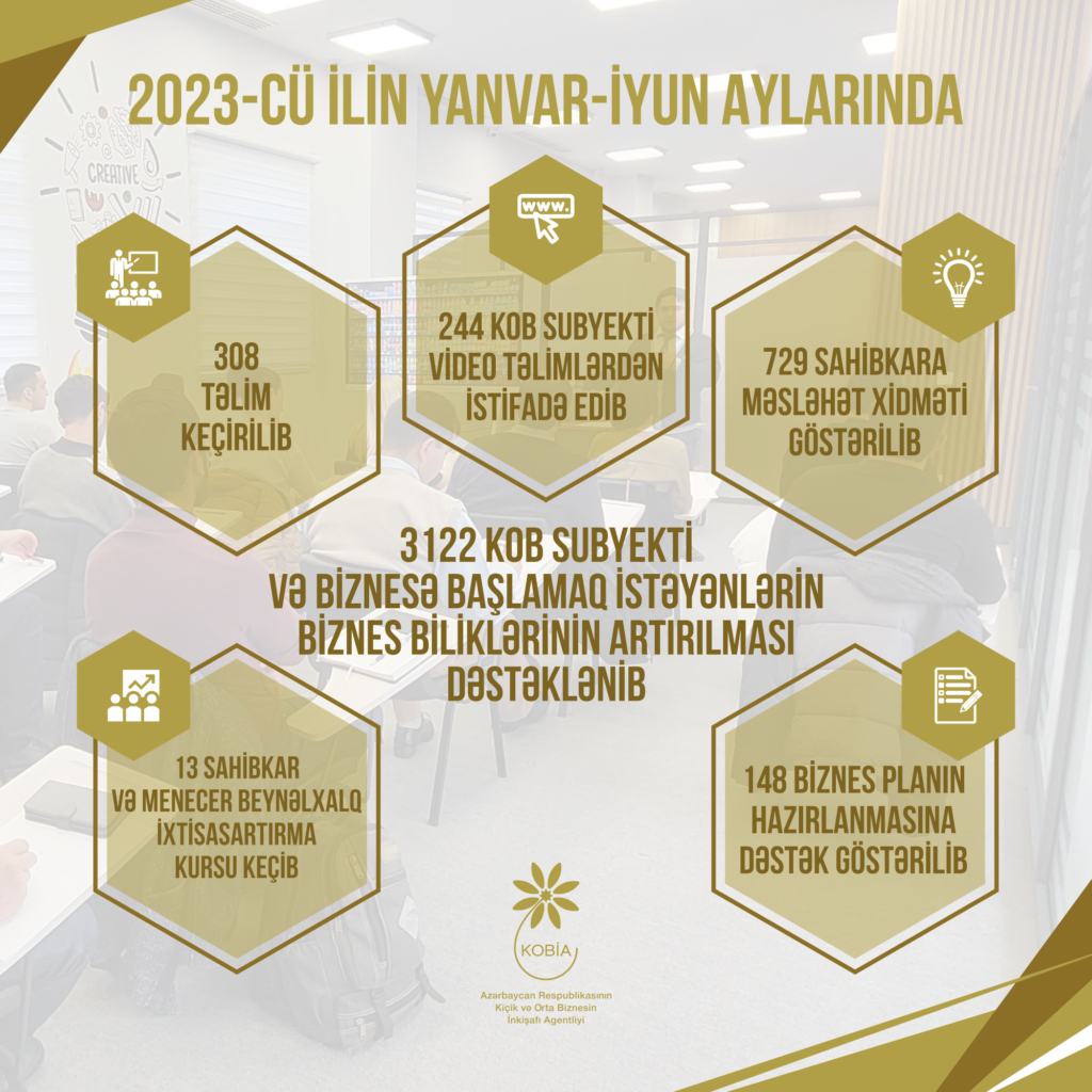 Bu ilin birinci yarısında Kiçik və Orta Biznesin İnkişafı Agentliyi (KOBİA) tərəfindən sahibkarların, biznesə başlamaq istəyənlərin və startapların biznes biliklərinə yiyələnməsi və mövcud biliklərinin artırılması üçün 308 təlim keçirilib. Agentliyin ölkənin müxtəlif şəhər və rayonlarında fəaliyyət göstərən KOB inkişaf mərkəzləri tərəfindən təşkil olunan təlimlər biznesə başla, layihə idarəetməsi, maliyyənin idarə olunması, satış, marketinq, rəqəmsal bacarıqlar, “yaşıl iqtisadiyyat” və digər mövzuları əhatə edib.