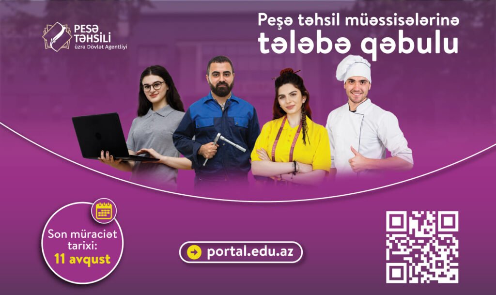 ️Peşə təhsili almaq istəyən şəxslər 11 avqust saat 23:59-dək portal.edu.az platformasında qeydiyyatdan keçməklə “Peşə təhsili müəssisələrinə elektron tələbə qəbulu” xidməti vasitəsilə müraciət göndərə bilərlər.