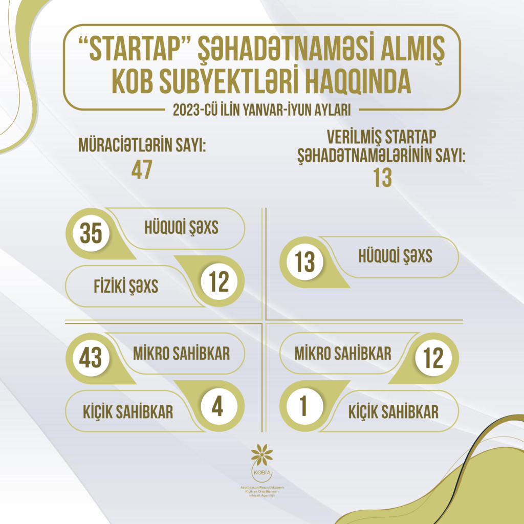 2023-cü ilin yanvar-iyun aylarında “Startap” şəhadətnaməsinin verilməsi üçün 47 mikro və kiçik sahibkar Kiçik və Orta Biznesin İnkişafı Agentliyinə (KOBİA) müraciət edib. Nazirlər Kabinetinin 29 yanvar 2021-ci il tarixli Qərarı ilə təsdiq olunmuş “Startapın müəyyən olunması meyarları”na əsasən Ekspertlər Şurası tərəfindən 12-si mikro, 1-i kiçik sahibkar olmaqla 13 KOB subyektinə şəhadətnamə verilib. “Startap” şəhadətnaməsi almış layihələr fintek, təhsil, səhiyyə, turizm, biznesin rəqəmsallaşması, elektron ticarət üzrə innovativ həlləri özündə ehtiva edən mobil tətbiq və onlayn xidmətləri əhatə edir.