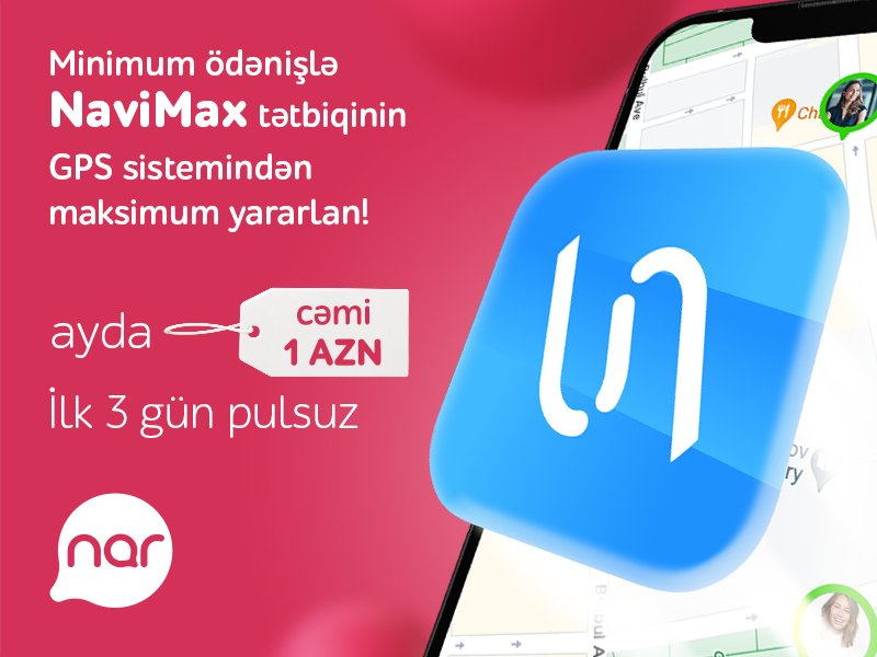 Artıq “Nar” abunəçiləri NaviMax tətbiqi ilə izlənmə funksiyası mümkün olan istənilən cihazın GPS izləmə vasitəsi ilə yerinə, hərəkətinə, qət etdiyi məsafəyə və digər göstəricilərinə minimum ödənişlə nəzarət edə bilərlər. Aylıq 1 AZN abunəlik haqqı ilə yaxınlarınızın olduğu məkanı həm real vaxtda, həm də oflayn rejimdə izləyib onların təhlükəsizliyini təmin edə bilərsiniz.