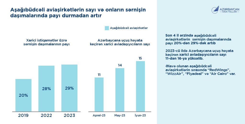 “Bu məlumatlar yeni aviaşirkətlərin cəlb edilməsi və sərnişinlər üçün imkanların genişləndirilməsi istiqamətində gedən davamlı fəaliyyətimizi təsdiqləyir. 2019-cu ildən etibarən xarici aşağıbüdcəli aviaşirkətləri seçən sərnişinlərin sayı 29%-ə yüksəlib. Biz bundan sonra da büdcəli səyahətlər üçün yeni perspektivlər açmağa və Bakını daha da əlçatan və cəlbedici turizm məkanına çevirməyə davam edəcəyik.” – deyə Heydər Əliyev Beynəlxalq Aeroportunun direktoru vurğulayıb.