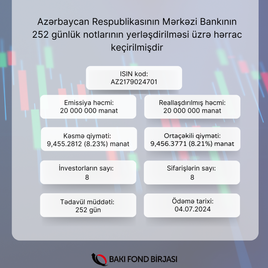 Azərbaycan Respublikasının Mərkəzi Bankının 252 günlük notlarının yerləşdirilməsi üzrə hərrac keçirilmişdir