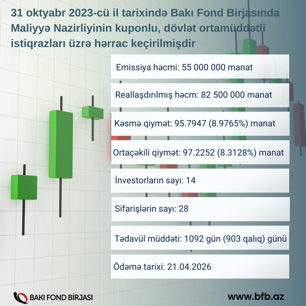 31 oktyabr 2023-cü il tarixində Bakı Fond Birjasında Azərbaycan Respublikası Maliyyə Nazirliyinin AZ0201040109 ISIN-li, 55 mln. manat həcmində, 1092 gün (903 qalıq gün) olan tədavül müddətli Kuponlu, Dövlət Ortamüddətli İstiqrazlarının (DOİ) yerləşdirilməsi üzrə hərrac keçirilmişdir.