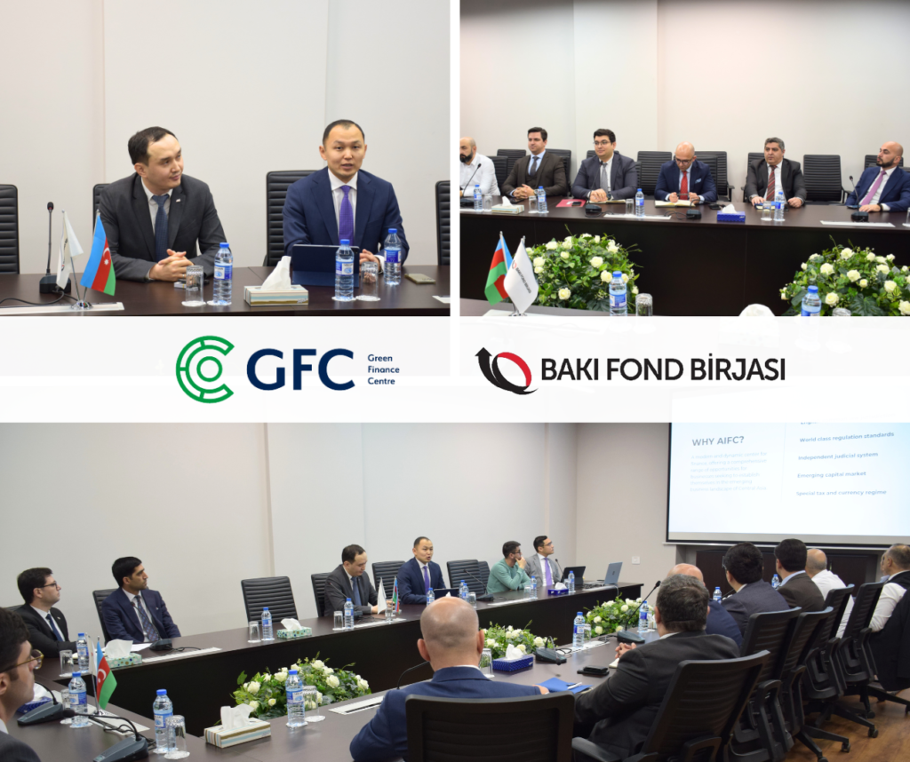 28 noyabr 2023-cü il tarixində Bakı Fond Birjasının təşəbbüsü və təşkilatçılığı əsasında Qazaxıstanın Astana Maliyyə Mərkəzinə bağlı Yaşıl Maliyyə Mərkəzinin nümayəndələri təqdimatla çıxış etmişlər.