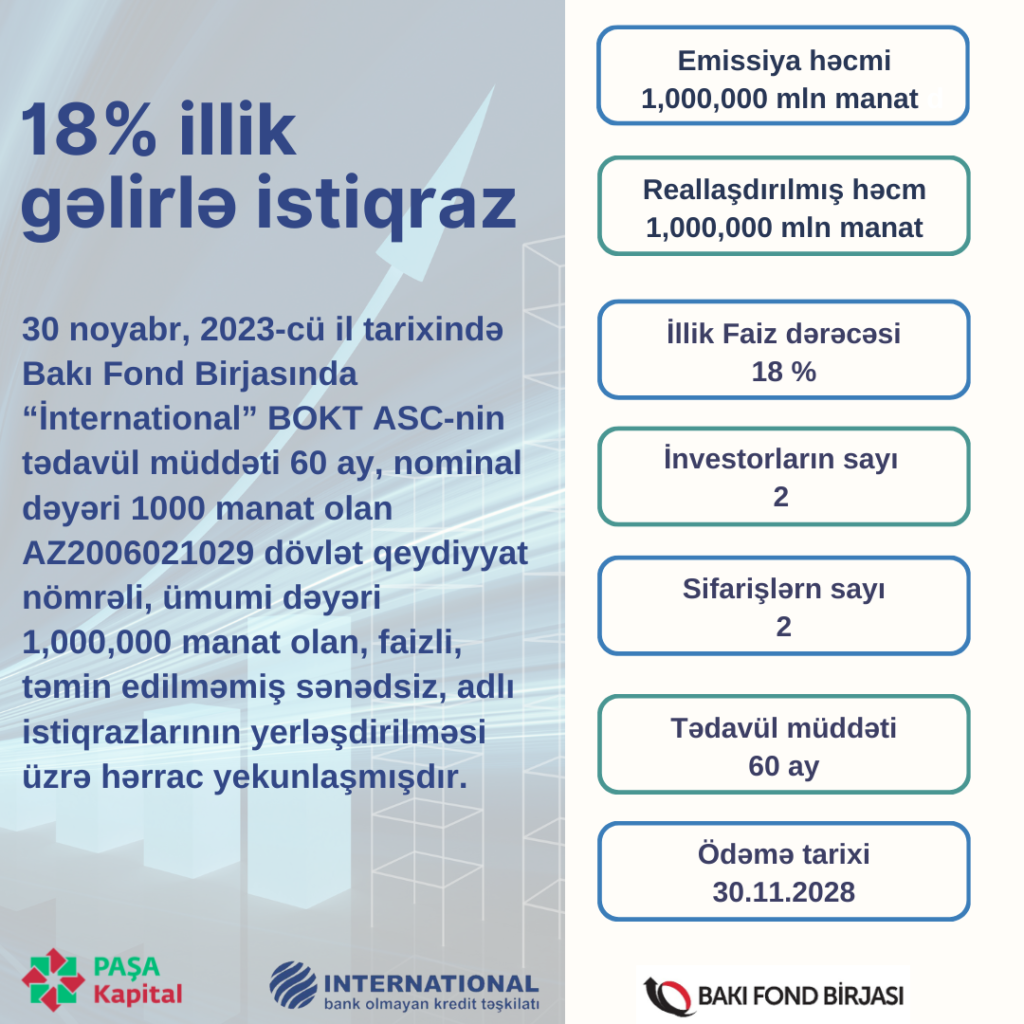 30 noyabr, 2023-cü il tarixində Bakı Fond Birjasında “İnternational” BOKT ASC-nin tədavül müddəti 60 ay, nominal dəyəri 1000 manat olan AZ2006021029 dövlət qeydiyyat nömrəli, ümumi dəyəri 1,000,000 (bir milyon) manat olan, faizli, təmin edilməmiş sənədsiz, adlı istiqrazlarının yerləşdirilməsi üzrə hərrac yekunlaşmışdır.