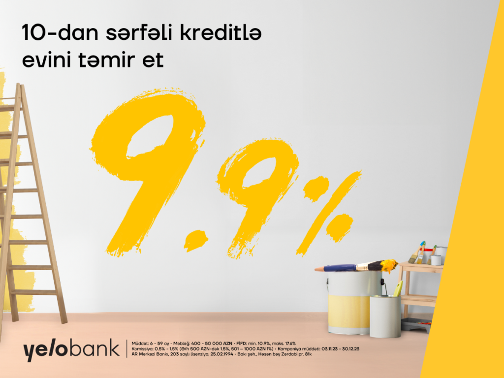 Evində təmir işləri aparmağı planlaşdıran hər kəsi bu fürsətdən faydalanmağa səsləyirik. Lakin tələsməyinizi də tövsiyə edirik, çünki illik 9.9% ilə kredit təklifi 31 dekabradək keçərlidir. Yeni ili yenilənmiş evinizdə qeyd etmək üçün Yelo Bank-ın ən yaxın filialına yaxınlaşa və ya onlayn kredit sifarişi edə bilərsiniz: bit.ly/onlnkrdt