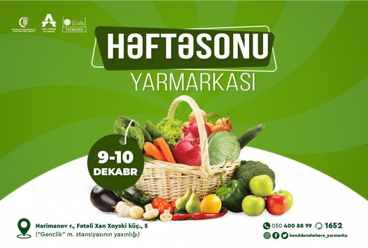 Kənd Təsərrüfatı Nazirliyindən verilən məlumata görə, Nərimanov rayonu, Fətəli xan Xoyski küçəsi, 5 (“Gənclik” metrostansiyasının yanı) ünvanında keçiriləcək yarmarkada müxtəlif regionlardan dəvət olunan fermerlər yerli kənd təsərrüfatı və qida məhsullarını satışa çıxaracaqlar.