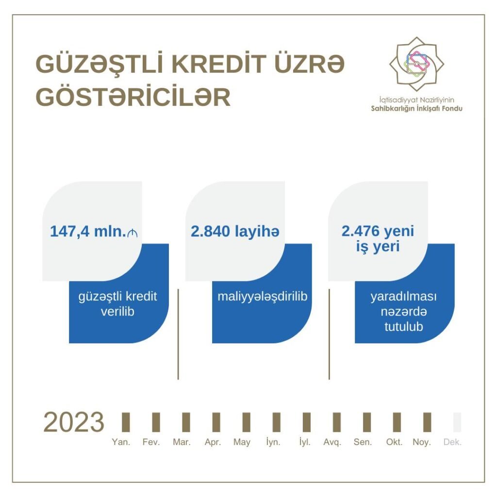 Bu ilin yanvar-noyabr ayları ərzində Sahibkarlığın İnkişafı Fondu tərəfindən 2840 layihənin maliyyələşdirilməsinə 147,4 milyon manat güzəştli kredit verilib.