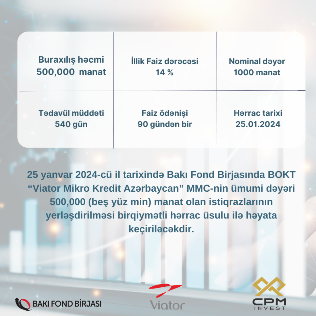 25 yanvar 2024-cü il tarixində BOKT “Viator Mikro Kredit Azərbaycan” MMC-nin ümumi dəyəri 500,000 (beş yüz min) manat olan istiqrazlarının yerləşdirilməsi Bakı Fond Birjasında birqiymətli hərrac üsulu ilə həyata keçiriləcəkdir.