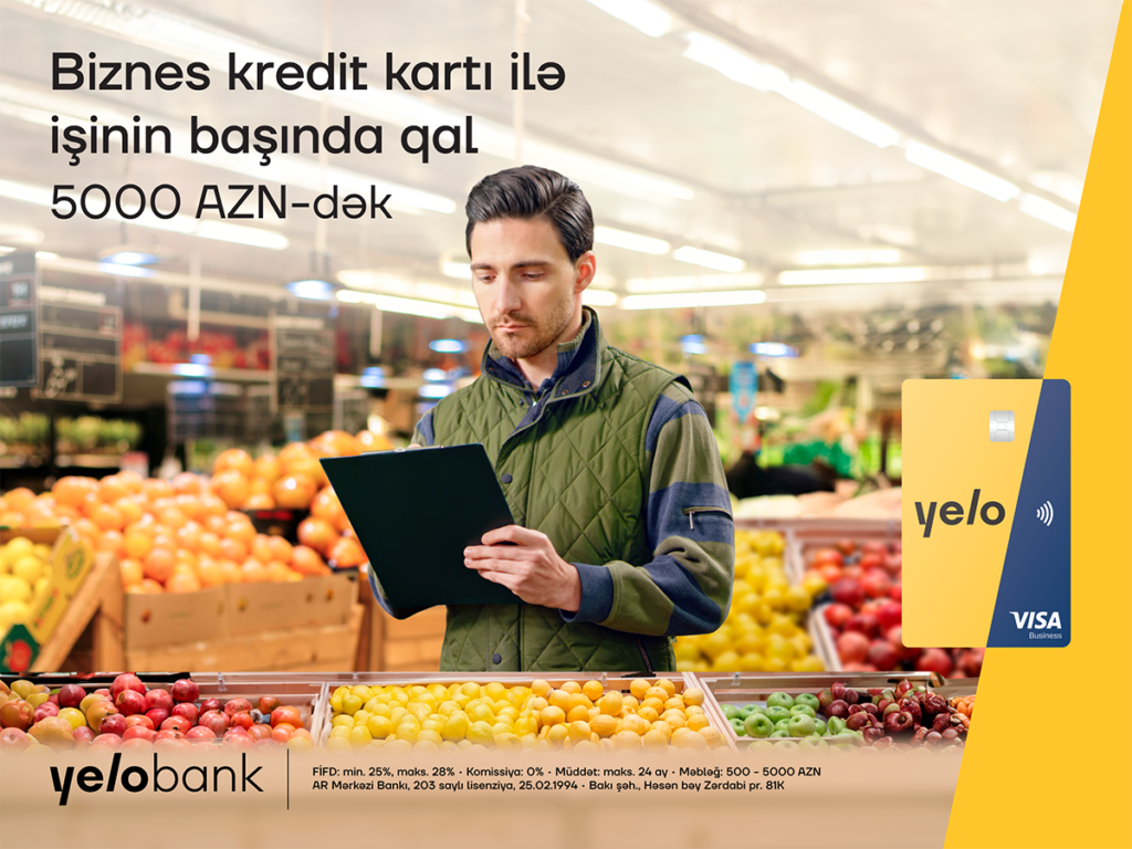 Biznes sahibləri üçün vaxtın dəyərini başa düşən Yelo Bank müraciət prosesini sadələşdirib. Sahibkarlar filiala yaxınlaşmadan Yelo App-də asanlıqla biznes kredit kartı üçün müraciət edə bilərlər. Müraciətə qısa zamanda baxılır və kart heç bir əlavə ödəniş etmədən birbaşa sahibkarın ünvanına çatdırılır. Mikro biznes kredit kartını Yelo App-in biznes bölməsində qeydiyyatdan keçərək və ya business.yelo.az saytından sifairş edə bilərsiniz. Kartı sifariş etmək üçün: https://bit.ly/ymkredit.