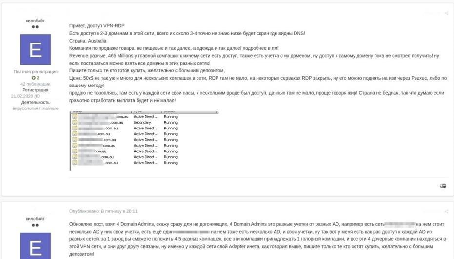 Araşdırmaya cəlb edilən reklamların 75%-də RDP-yə (uzaqdan qoşulma protokolu) giriş məlumatları, yəni şirkətin infrastrukturuna hazır giriş satılıb. Qiymətlər təşkilatın fəaliyyət göstərdiyi sənaye və regiondan, həmçinin gəlirinin ölçüsündən və təcavüzkarların qanuni hesabə əldə edərək nə qədər “qazana biləcəklərindən” asılıdır. Elanların birində, məsələn, 465 milyon dollar mənfəəti olan bir şirkətin şəbəkəsinə qanuni giriş imkanı üçün 50 min dollar qiymət qoyulub.