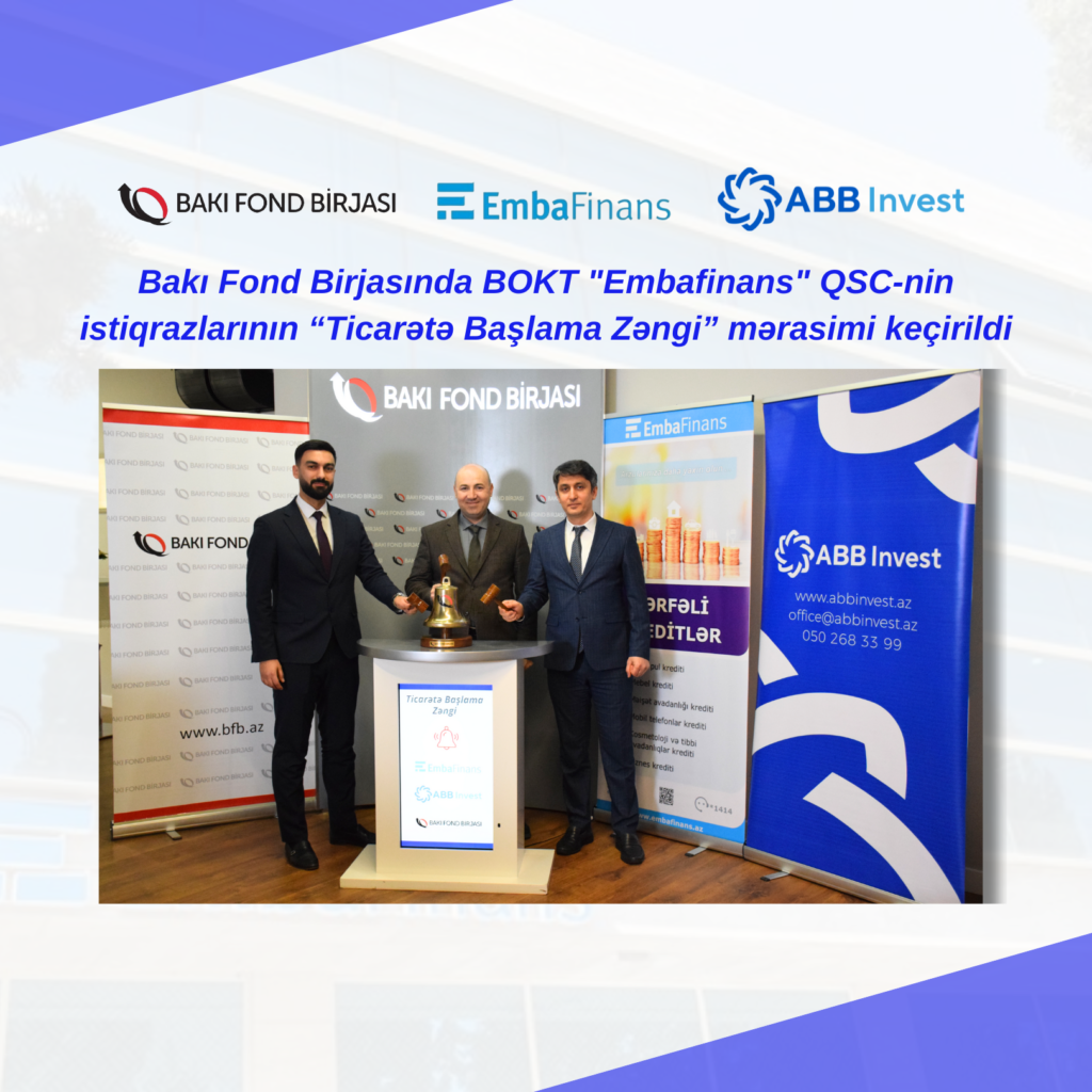 1 mart 2024-cü il tarixində Bakı Fond Birjasında BOKT “Embafinans” QSC-nin kapital bazarlarında növbəti istiqraz buraxılışını qeyd etmək məqsədi ilə “Ticarətə Başlama Zəngi” mərasimi keçirilmişdir. 1,500,000 (bir milyon beş yüz min) manat həcmində olan yerləşdirmənin anderrayteri BFB-nin üzvü olan “ABB-İnvest İnvestisiya Şirkəti” QSC-dir.