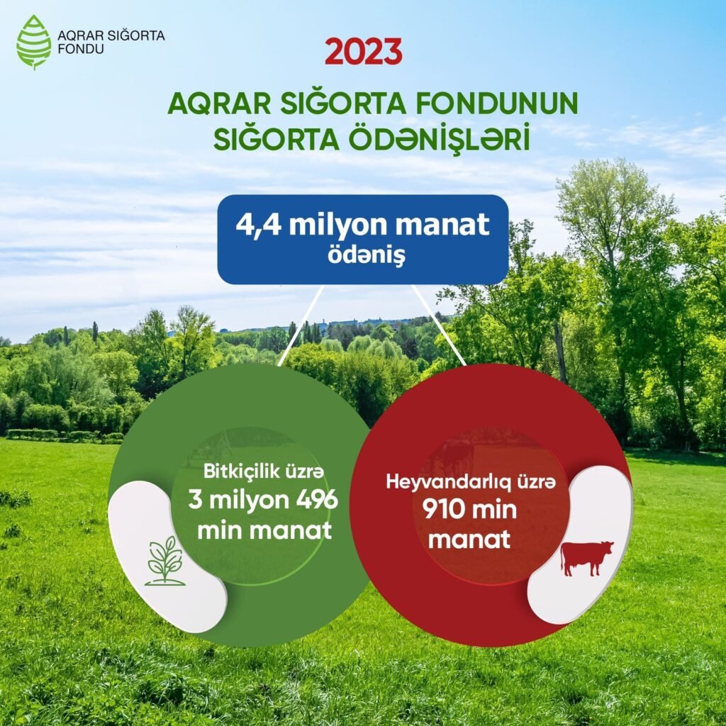 2023-cü ildə aqrar sığorta mexanizminin fermerlərə dəstəyi daha da güclənib. Aqrar Sığorta Fondu tərəfindən sığortalı fermer və təsərrüfatlara böyük məbləğdə ödənişlər edilib. Belə ki, sığorta ödənişləri 2022-ci illə müqayisədə 2 milyon manat və ya 80% artaraq 4,4 milyon manata yüksəlib. Ödənişlərdən 3,5 milyon manatı bitkiçilik, 910 min manatı heyvandarlıq sığortasının payına düşüb. Bitkiçilik üzrə ödənişlər 2 dəfə, heyvandarlıq sığortası üzrə 28% artıb.