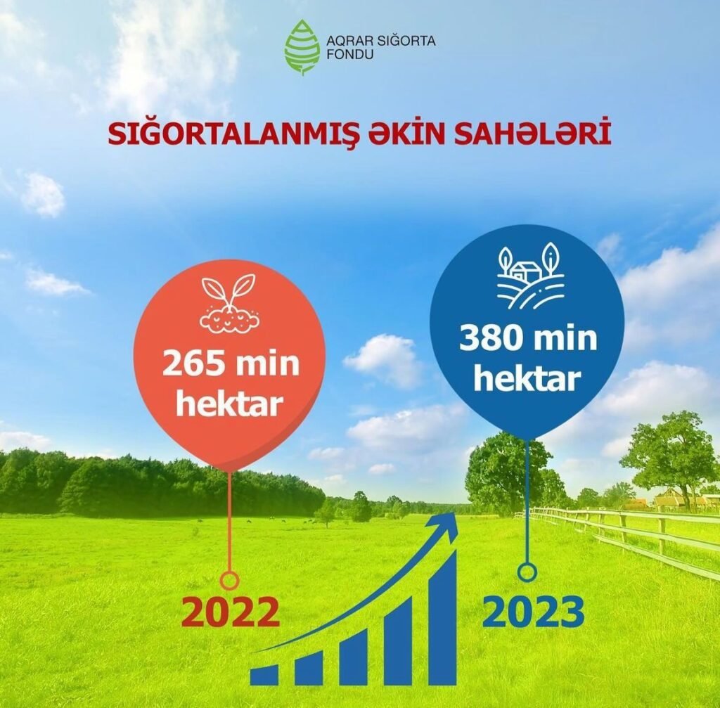 2023-cü ildə ölkə üzrə sığortalanmış əkinlərin sahəsi 114 min hektar və ya 43% artaraq 380 476 hektara çatıb. Əkin sahələrinin sığortası üzrə fermer və təsərrüfatlarla 43 min müqavilə imzalanıb.