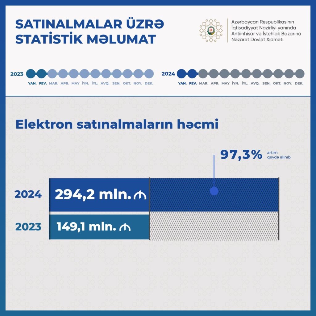 2024-cü ilin yanvar-fevral ayları ərzində elektron satınalmaların ümumi satınalmalarda payı məbləğ üzrə 294,2 milyon manat təşkil edib.