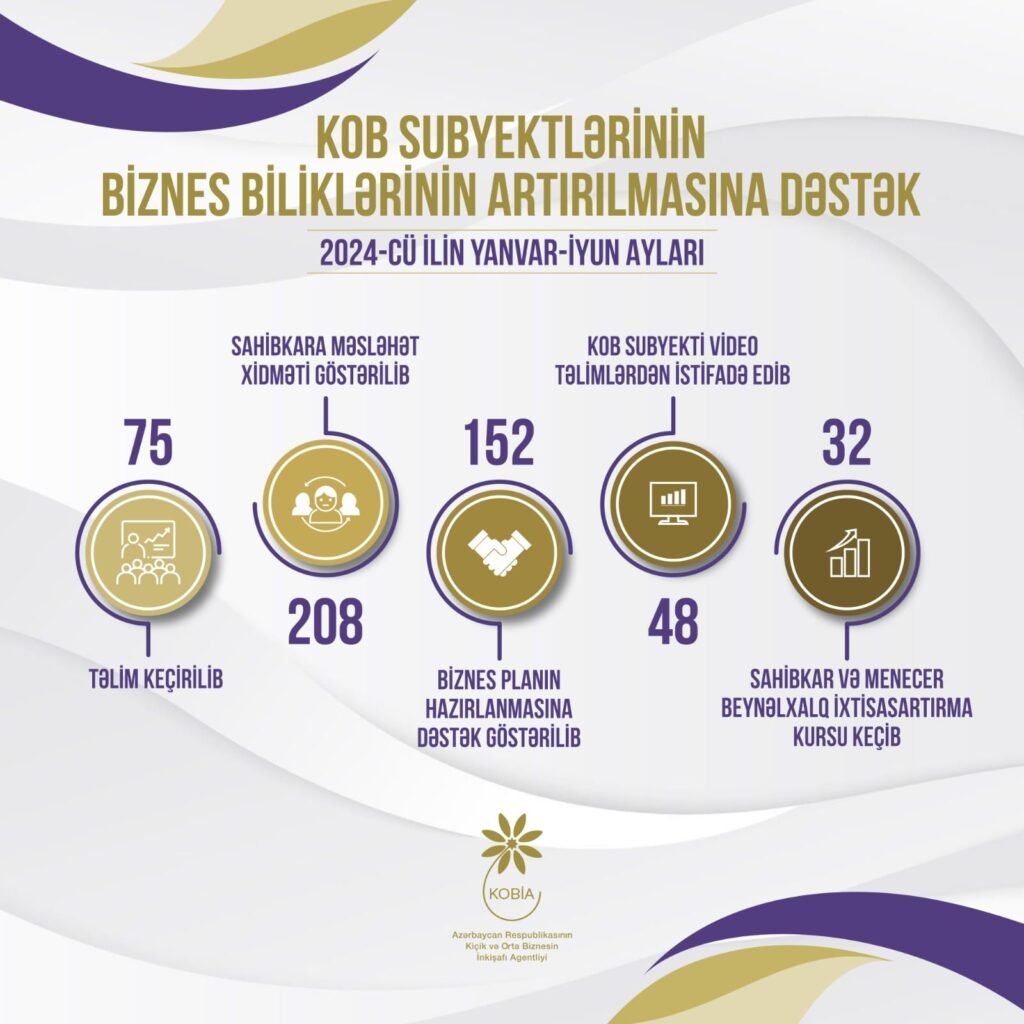 Bu ilin birinci yarısında Kiçik və Orta Biznesin İnkişafı Agentliyi (KOBİA) tərəfindən sahibkarların, biznesə başlamaq istəyənlərin və startapların biznes sahəsində bilik və bacarıqlara yiyələnməsi, mövcud biliklərinin artırılması üçün 800-ə yaxın iştirakçı üçün 75 təlim keçirilib. Təlimlər biznesə başla, layihə idarəetməsi, maliyyənin idarə olunması, satış, marketinq, rəqəmsal bacarıqlar, “yaşıl iqtisadiyyat” və digər mövzuları əhatə edib.