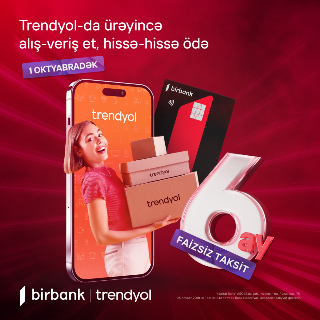 Ölkənin ilk rəqəmsal bankı Birbank taksit kartı sahibi olan müştərilərinə özəl həyata keçirdiyi kampaniyanın vaxtını 1 okyabr 2024-cü il tarixinədək artırıb. Belə ki, “Trendyol” istifadəçiləri istədikləri məhsulu sifariş edərkən Birbank taksit kartları ilə 6 aylıq faizsiz taksit imkanından yararlana bilərlər.