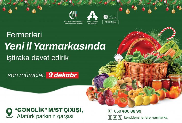 Azərbaycanın müxtəlif bölgələrindən olan fermerlər təsərrüfatlarında yetişdirdikləri məhsulları Yeni il yarmarkasında satışa çıxara biləcəklər. Fermerlər yarmarkada iştirak üçün yer, piştaxta, tərəzi və digər lazımi avadanlıqlarla ödənişsiz şəkildə təmin olunacaqlar.