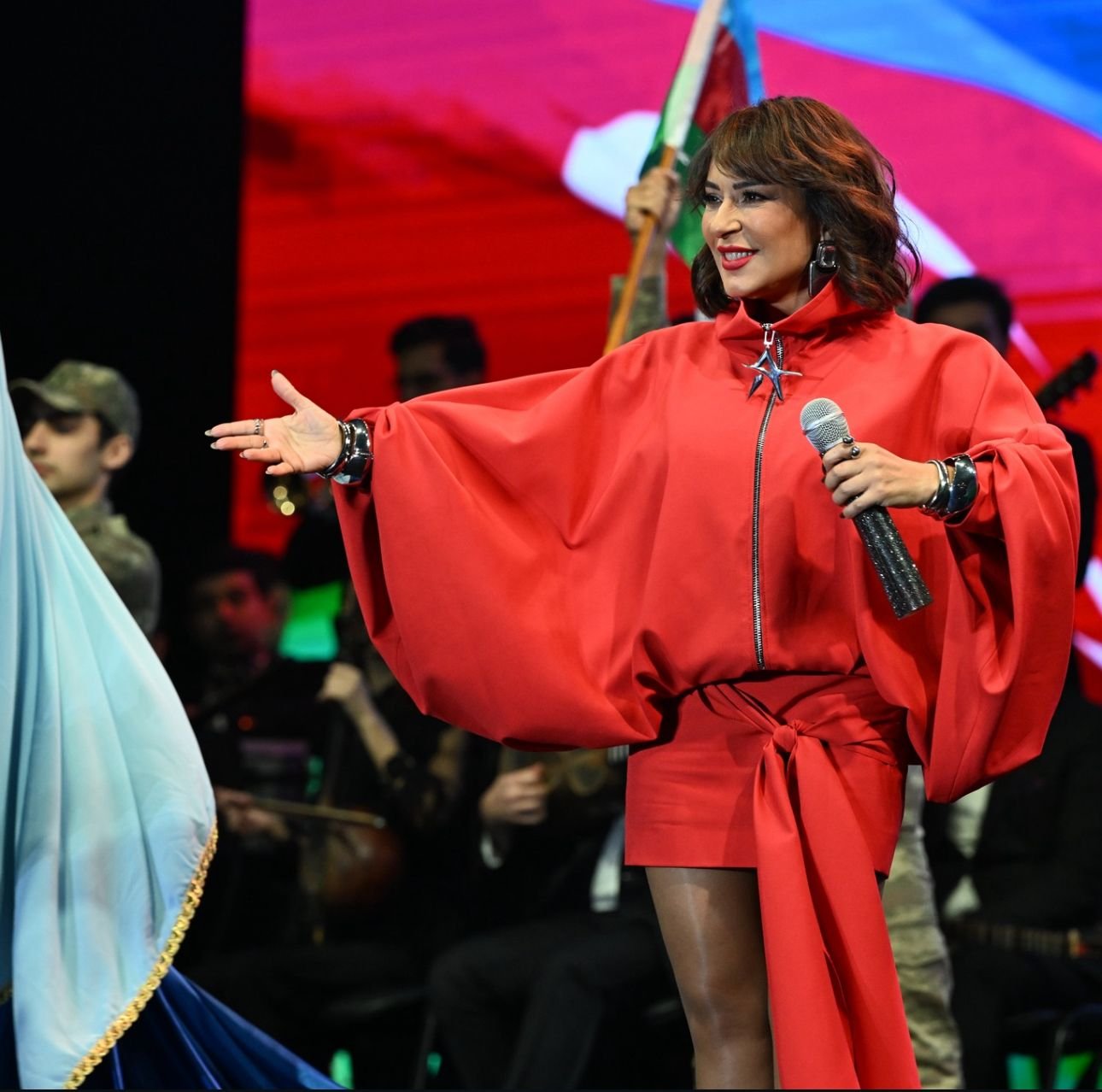 Rockvell xəbər verir ki, pop ulduz Bulvar ərazisində keçirilən möhtəm konsertdə çıxış edib. Qırmızılara bürünən sənətçi “Gözün aydın olsun, Qarabağ” əsərini səsləndirib. Füsunkar görünən sevilən ulduzu səhnədə rəqqaslar müşayiət edib. Səhnə şousu qədər ulduzun geyimi də diqqət çəkib. Libasının müəllifi dizayner Lali Rüstəmovadır.