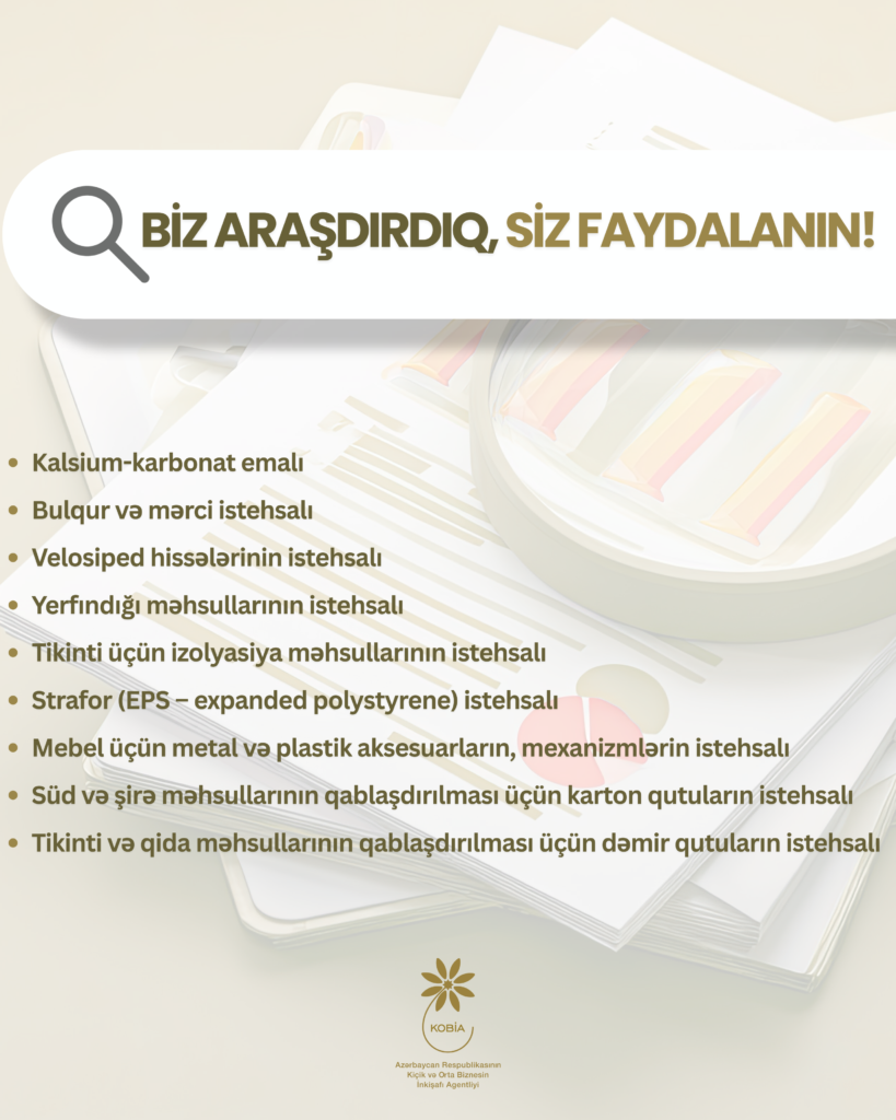 Kiçik və Orta Biznesin İnkişafı Agentliyinin (KOBİA) təşəbbüsü ilə sahibkarlar üçün 9 istiqamət üzrə daxili bazar araşdırmaları aparılıb. Araşdırmalar aşağıdakı sahələri əhatə edir: