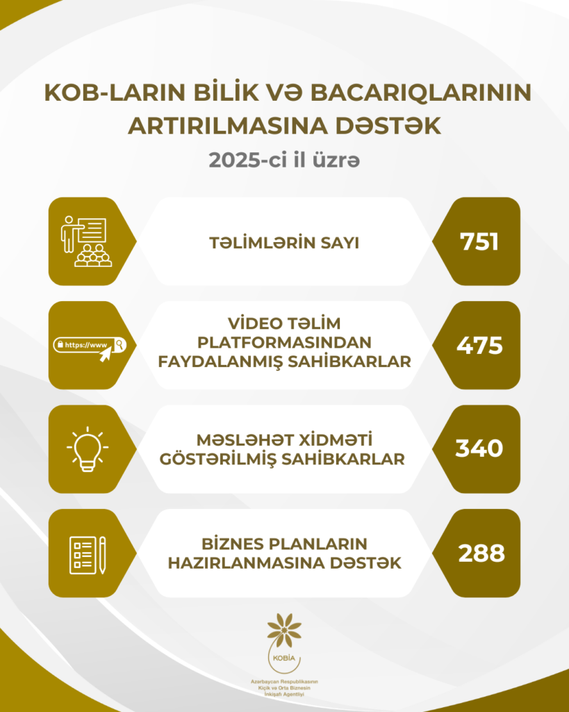 2025-ci ildə KOB subyektlərinin biznes sahəsində bilik və bacarıqlarının yaxşılaşdırılması, sahibkarlığa dair məlumatlılıq səviyyəsinin artırılması məqsədilə Kiçik və Orta Biznesin İnkişafı Agentliyi (KOBİA) tərəfindən 751 təlim təşkil olunub. Bakı şəhərini və regionları əhatə edən təlimlər KOB-ların ehtiyaclarına uyğun olaraq satış, marketinq, mühasibatlıq, işçi heyətinin idarə edilməsi, brendləşmə, biznesdə innovasiyaların tətbiqi, biznes planın hazırlanması, layihələrin idarə olunması, “yaşıl iqtisadiyyat” və digər mövzuları əhatə edib. Agentliyin video təlim platformasında yerləşdirilmiş onlayn təlim videolarından, təlim materialları və özünüqiymətləndirmə testlərindən isə 475 sahibkar və biznesə başlamaq istəyən şəxs faydalanıb.