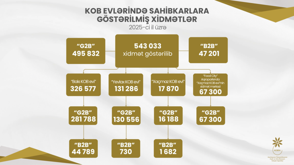 2025-ci ildə sahibkarlara vahid məkanda xidmətlərin göstərildiyi KOB evlərində ümumilikdə 543 033 xidmət göstərilib. Bu xidmətlərin 327 minə yaxını “Bakı KOB evi”nin, 131 mindən çoxu “Yevlax KOB evi”nin, 18 minə yaxını “Xaçmaz KOB evi”nin, 67 mindən çoxu isə “Xaçmaz KOB evi”nin “Food City” Aqroparkında yerləşən xidmət mərkəzinin payına düşür.