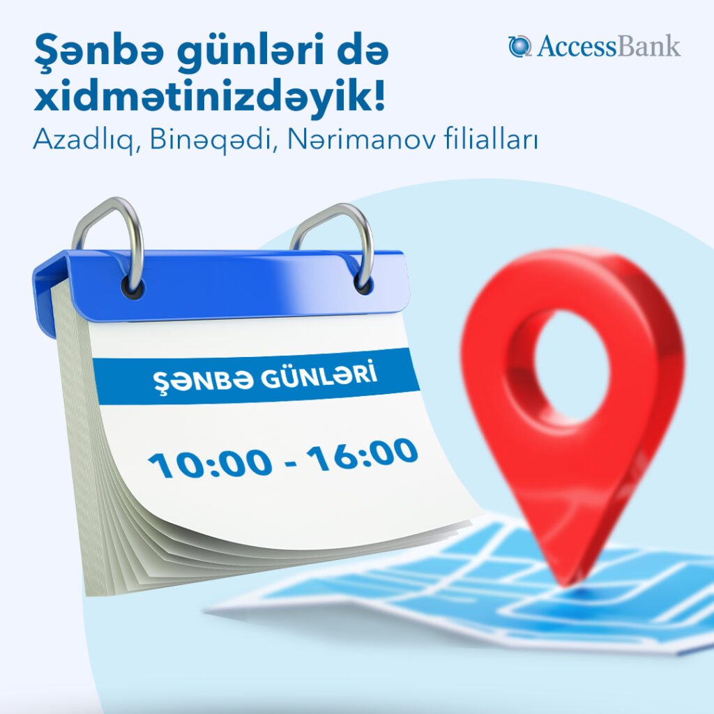 ünvanlarında yerləşən filialları şənbə günləri 10.00-16.00 saatlarında fəaliyyət göstərəcək. AccessBank Azərbaycanda mikromaliyyələşdirmə lideri olaraq, 2002-ci ildən kiçik və orta bizneslərə xidmət göstərir. Bankın səhmdarları sırasında Asiya İnkişaf Bankı, Avropa İnvestisiya Bankı, Beynəlxalq Maliyyə Korporasiyası kimi beynəlxalq təşkilat və qurumlar yer alır. Bankın 15-i Bakıda, 14-ü bölgələrdə olmaqla, 29 filialı fəaliyyət göstərir.