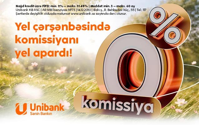 Unibank Yel çərşənbəsi münasibəti ilə xalqımızı təbrik edir, hər evə xoş günlər, ruzi – bərəkət arzulayır. Baharın müjdəçisi olan bu əlamətdar günlərdə Bank yeni planlarınız üçün sərfəli kredit aksiyası keçirir. Bu gün “Unibank”dan kredit rəsmiləşdirən hər kəs nağd krediti 0 % komissiya ilə əldə edəcək.