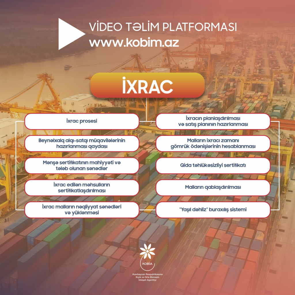 Qeyd edək ki, video təlim platforması sahibkarların təlim imkanlarının və biznes sahəsində qabaqcıl təcrübənin tətbiqinin genişləndirilməsi məqsədilə innovativ yanaşmaya və müasir təcrübəyə əsaslanmaqla Kiçik və Orta Biznesin İnkişafı Agentliyi (KOBİA) tərəfindən yaradılıb. Platformanın əsas üstünlükləri istifadəçinin yaşadığı yeri tərk etmədən, istədiyi vaxtda və istədiyi yerdən təlimləri izləmək imkanıdır. Digər bir üstünlük isə platformadan istifadənin ödənişsiz olmasıdır. İndiyədək onlayn təlim platformasından mindən çox sahibkar, startap və biznesə başlamaq istəyən şəxslər yararlanıb. Video təlimlərdən “www.kobim.az” saytında qeydiyyatdan keçməklə faydalanmaq olar.