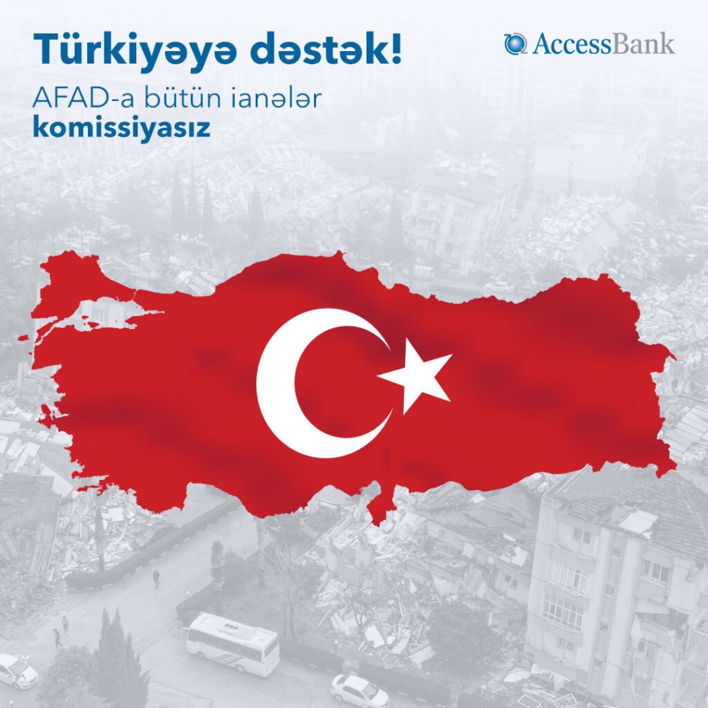 Türkiyədə baş vermiş təbii fəlakətlə bağlı olaraq, dəstək olmaq istəyənlərin nəzərinə: AccessBank Türkiyəyə yardım məqsədli köçürmələr üzrə komissiya xərclərini üzərinə götürür.